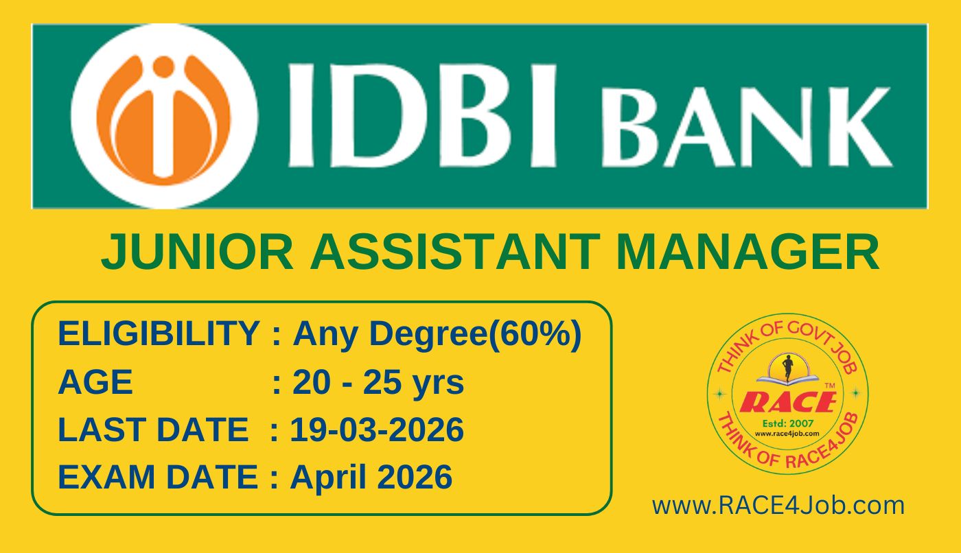 IDBI JUNIOR ASST MANAGER 2026. Eligibilty: Any Graduation(60%).(as on 01-03-2026): Age:20-25yrs (as on 01-03-2026). LAST DATE to Apply: 19-03-2026 Click for Details