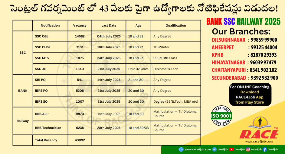 Are you preparing for Central Government Jobs in 2025? Here’s a golden opportunity! With over 43,000+ vacancies released across SSC, Banking, and Railway sectors, now is the best time to start your preparation. This blog post covers detailed information about vacancies, eligibility, important dates, and age limits for major exams like SSC CGL, SSC CHSL, SBI PO, IBPS PO, RRB ALP, and more.