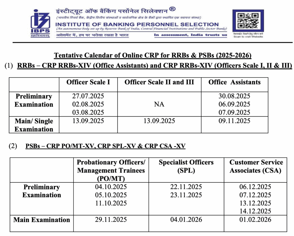 PSBs – CRP PO/MT-XV Exam Dates 2025