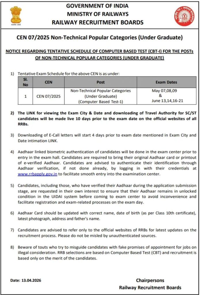 The Railway Recruitment Board (RRB) has released the official notice for the RRB NTPC Undergraduate Exam Date 2026 for UG (12th) level posts (CEN 07/2025) at the official website http://www.rrbcdg.gov.in/ on 13th April 2026. As per the notice, the CBT 1 Exam for UG Level posts will be conducted from 7th May to 21st June 2026 (7th, 8th, 9th May and 13th, 14th, 16th, 17th, 18th, 19th, 20th, and 21st June 2026). The details regarding the exam, including exam date, timing, exam venue, etc., will be released along with the admit card.